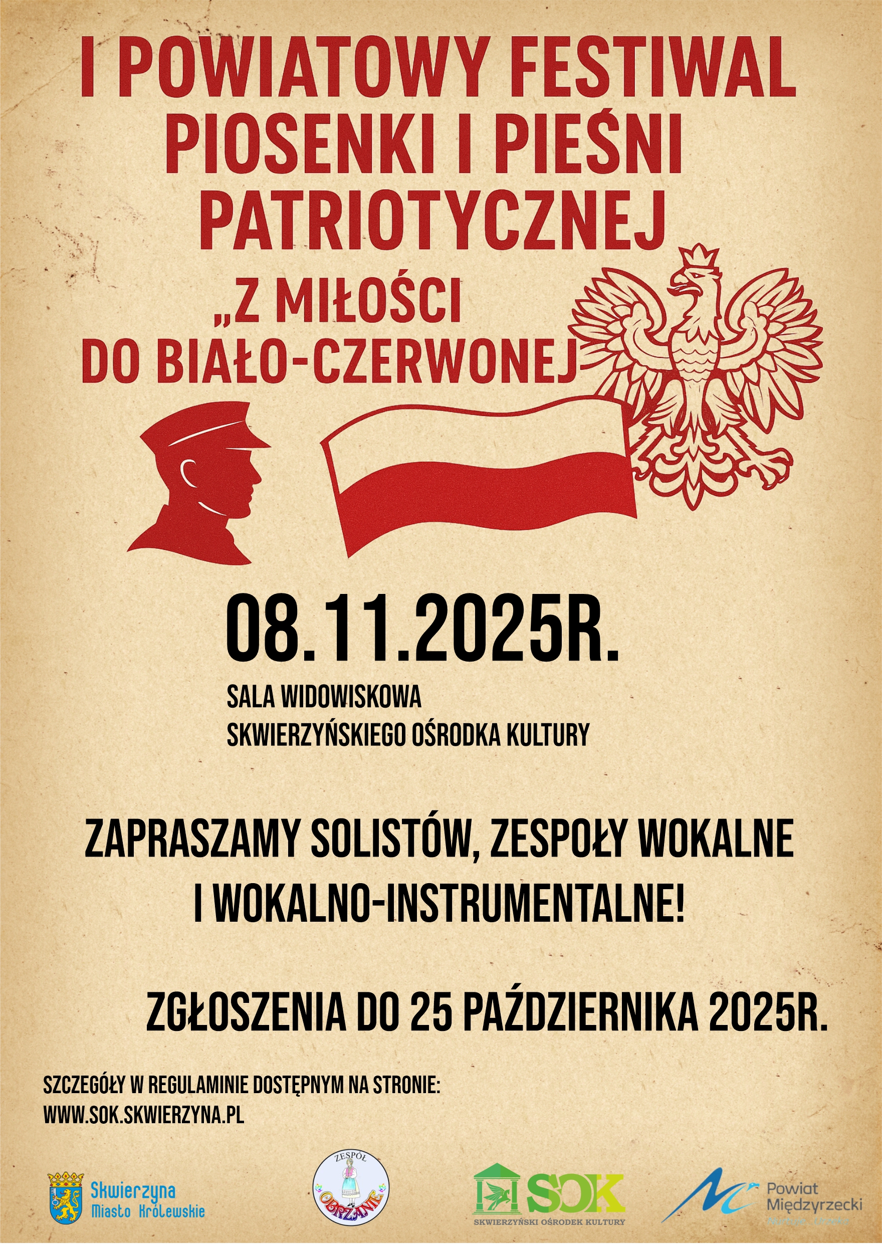 Stowarzyszenie Miłośników Zespołu "OBRZANIE" we współpracy ze Skwierzyńskim Ośrodkiem Kultury organizuje I Powiatowy Festiwal Pieśni i Piosenki Patriotycznej o nazwie "Z miłości do Biało-Czerwonej".
