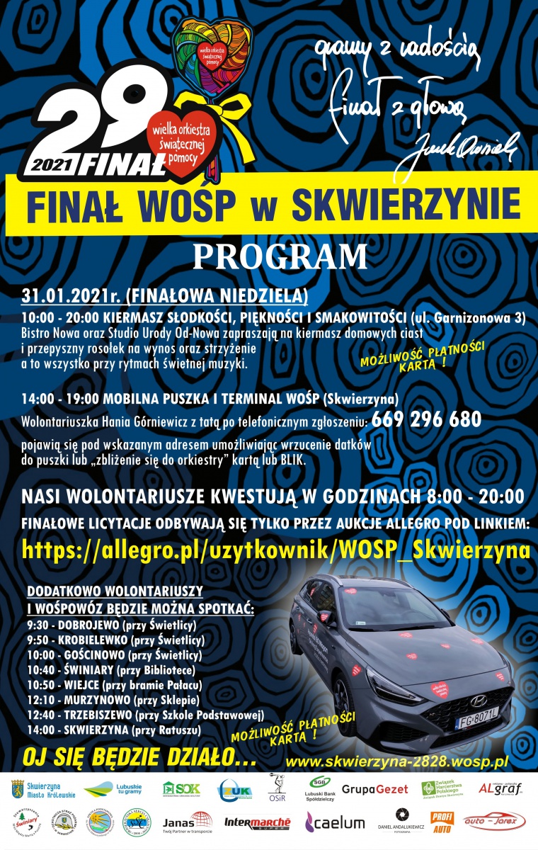 Sztab WOŚP SOK Skwierzynie dołożył i dokłada wszelkich starań, aby tegoroczny Finał był kolorowy, radosny i piękny! 29. Finał WOŚP można wesprzeć na kilka sposobów z zachowaniem wszelkich norm i obostrzeń sanitarnych: