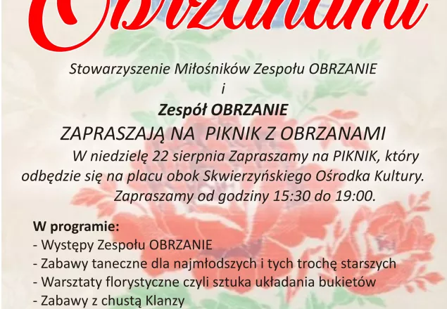 Stowarzyszenie Miłośników Zespołu ORZANIE i Zespół OBRZANIE ma przyjemność zaprosić mieszkańców i gości Gminy Skwierzyna na PIKNIK Z OBRZANAMI, który odbędzie się w niedzielę 22 sierpnia w godzinach od 15:30 do 19:00 na placu koło Skwierzyńskiego Ośrodka Kultury.