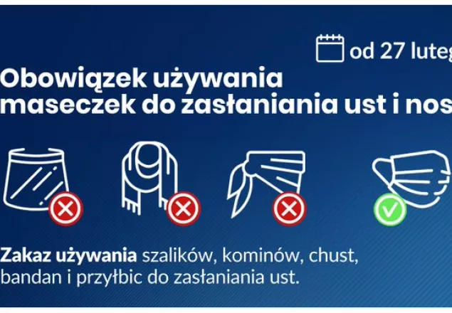 Najważniejsze zmiana, która wejdzie w życie od soboty 27.02.2021 r. - zakaz noszenia przyłbic, szalików, chust itp. Usta i nos można będzie zasłaniać jedynie maseczkami.