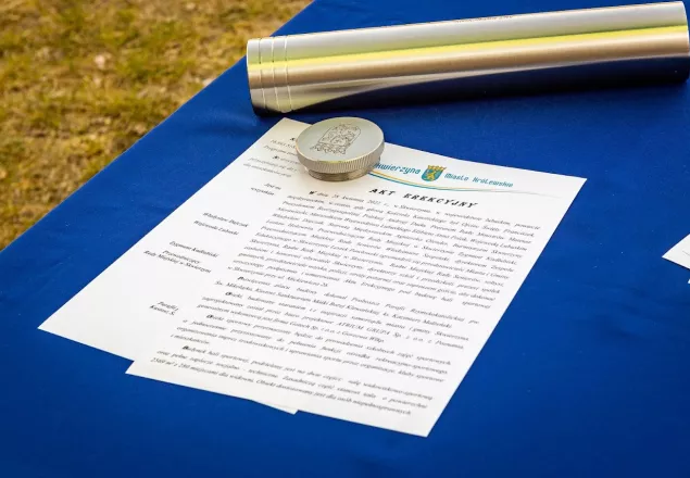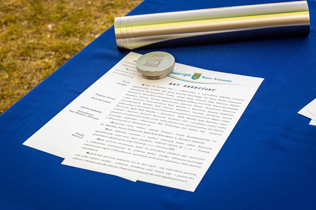 W Akcie Erekcyjnym znalazły się informacje pozostawione dla potomnych, na temat obecnych władz Polski, naszego województwa, powiatu, gminy i szkoły. Napisano też o inicjatorach budowy, projektancie, wykonawcy i tym, jak ma wyglądać sala i do czego ma służyć. Na akcie swoje podpisy złożyli: Wojewoda Lubuski Władysław Dajczak, Burmistrz Skwierzyny Lesław Hołownia, Przewodniczący Rady Miejskiej w Skwierzynie Zygmunt Kadłubiski, Dyrektor Zespołu Edukacyjnego w Skwierzynie Leszek Pawłowski, Proboszcz Parafii pw. Św. Mikołaja w Skwierzynie – Kustosz Sanktuarium Matki Bożej Klewańskiej ks. Kazimierz Małżeński. Ponadto do kapsuły czasu włożono imienną listę przybyłych gości oraz cyfrowy zapis zdjęć z uroczystości.