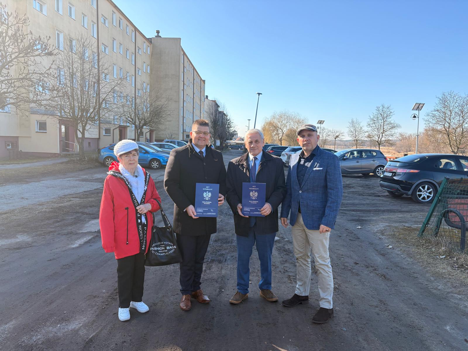 W dniu 6 marca 2026 r., Burmistrz Skwierzyny Wojciech Kowalewski podpisał umowę notarialną na mocy, której gmina Skwierzyna otrzymała od mieszkańców zrzeszonych w Spółdzielni Mieszkaniowej Lokatorsko-Własnościowej, ul. Niepodległości 1E prawo własności do nieruchomości, na której obecnie parkowane są samochody oraz zlokalizowana jest droga wewnętrzna przed budynkiem ul. Rynek 16.