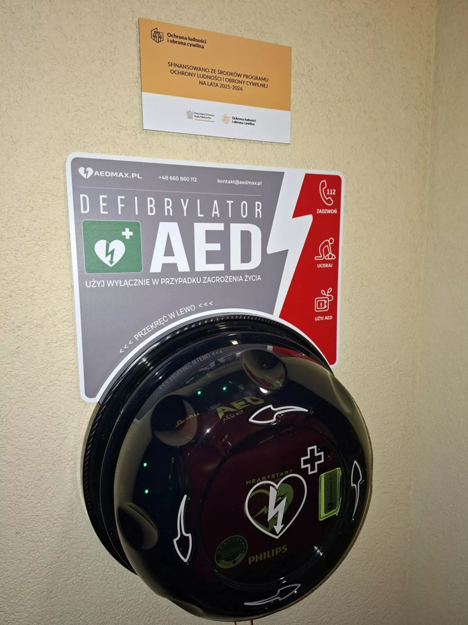 Zakup 3 defibrylatorów AED oraz 100 sztuk apteczek osobistych. Nowe defibrylatory zostały zamontowane na budynkach sal wiejskich w Krobielewku, Gościnowie i Wiejcach. Dodatkowo mieszkańcy mieli możliwość wzięcia udziału w szkoleniu z zakresu Kwalifikowanej Pierwszej Pomocy oraz obsługi defibrylatora AED, przeprowadzonego przez certyfikowanego instruktora. Wartość zakupu wyniosła 38 991, 48 zł, w całości sfinansowana z "Programu Ochrony Ludności i Obrony Cywilnej na lata 2025-2026".